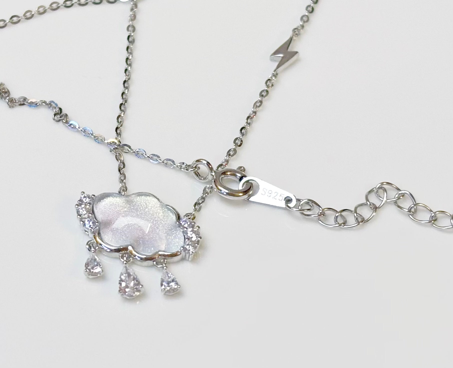 Funkelnde Details: Kleine Zirkonia-Steine schmücken die Seiten der Wolke, während drei tropfenförmige Zirkonia-Anhänger wie Regentropfen sanft herabhängen.